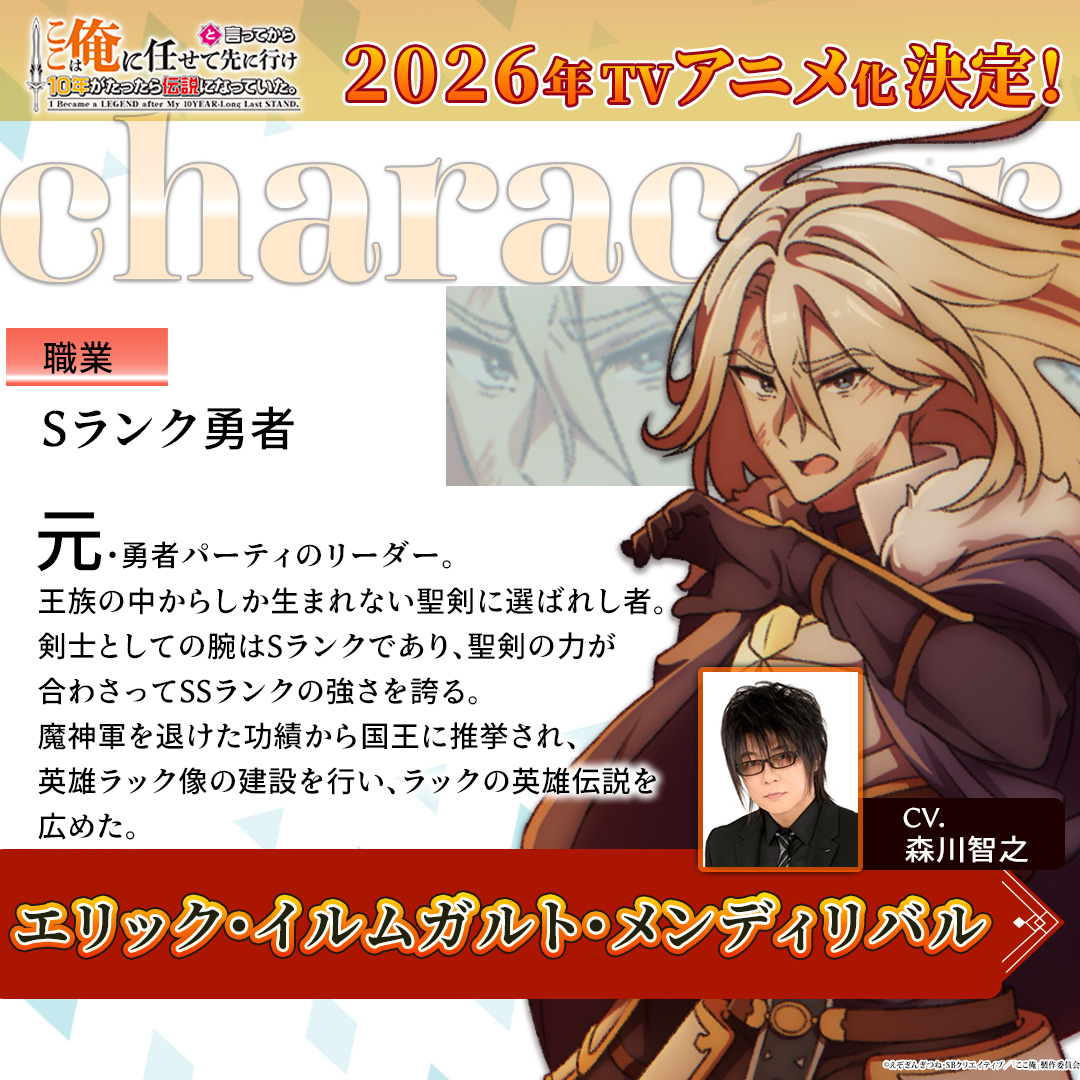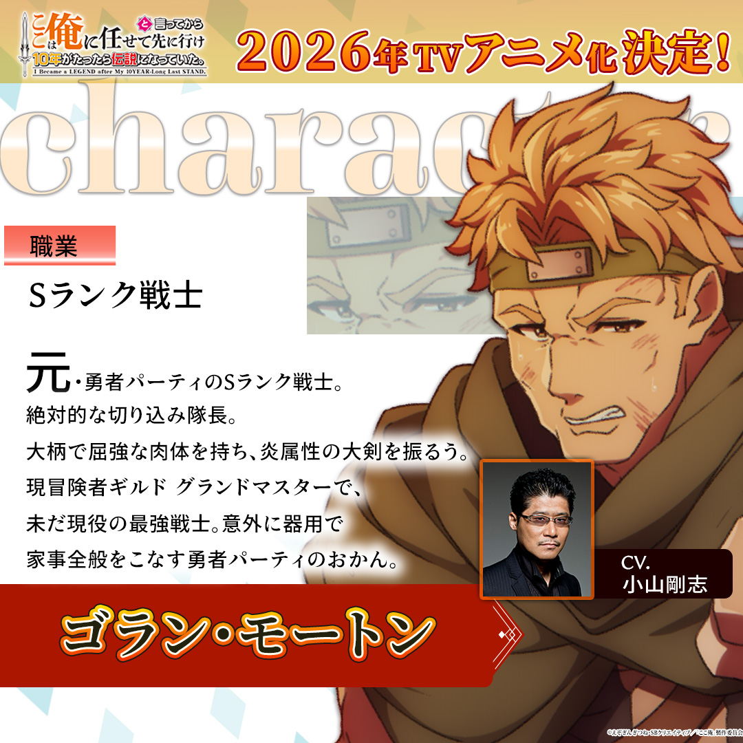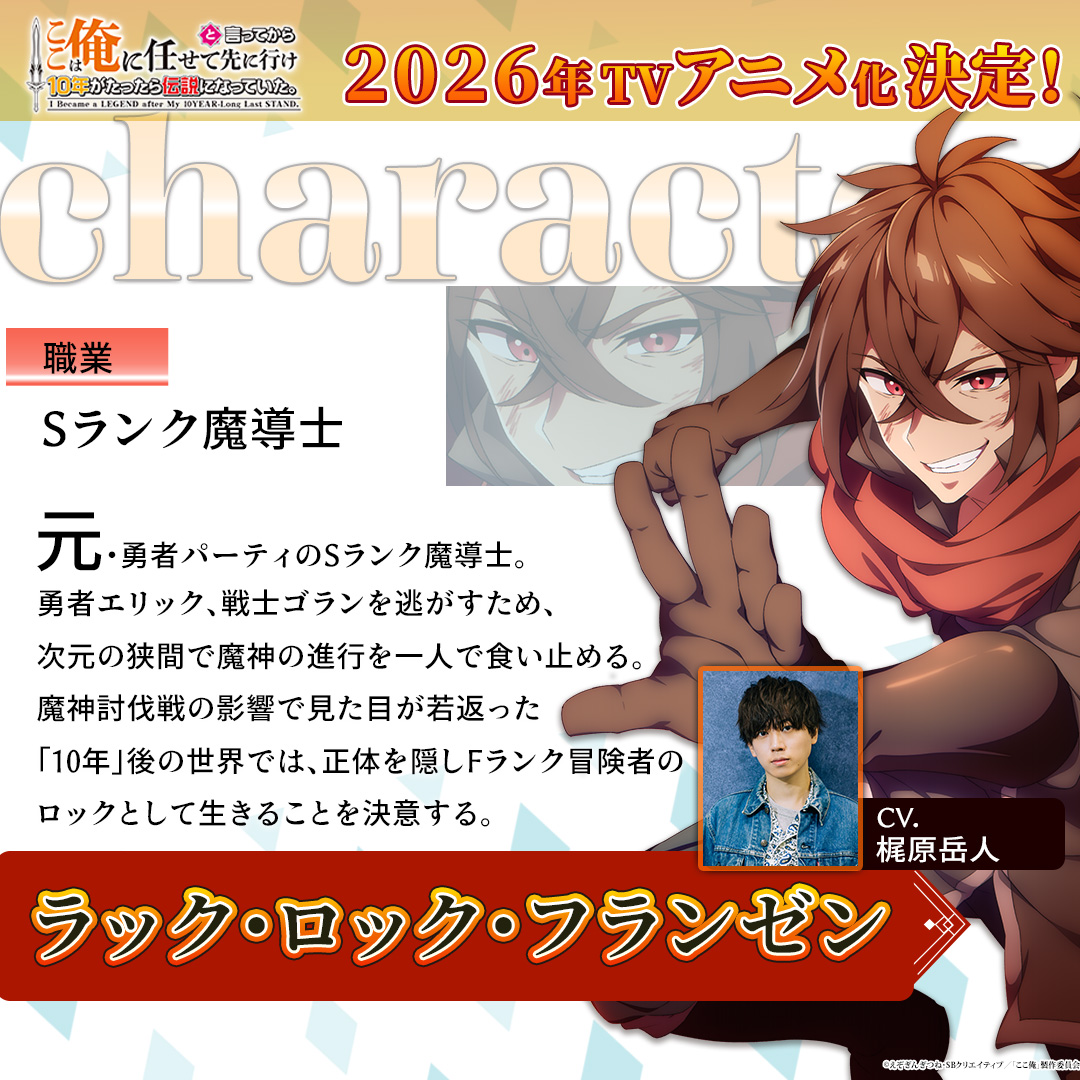 小説投稿サイト「小説家になろう」などで人気のえぞぎんぎつねさんのライトノベル「ここは俺に任せて先に行けと言ってから10年がたったら伝説になっていた。」が2026年にテレビアニメ化されることが分かった。神戸洋行さんが監督を務め、月虹が制作する。主人公・ラック役の梶原岳人さん、勇者のエリック役の森川智之さん、戦士のゴラン役の小山剛志さんが出演することも発表された。