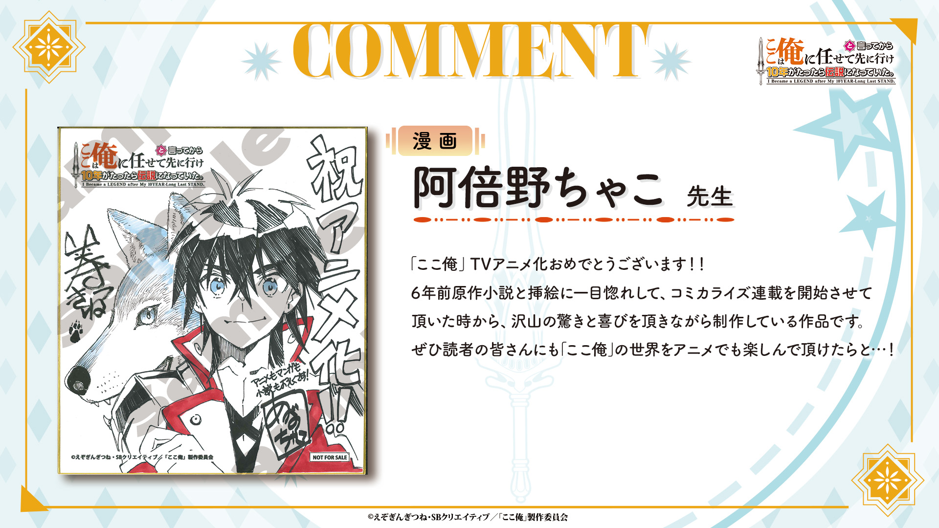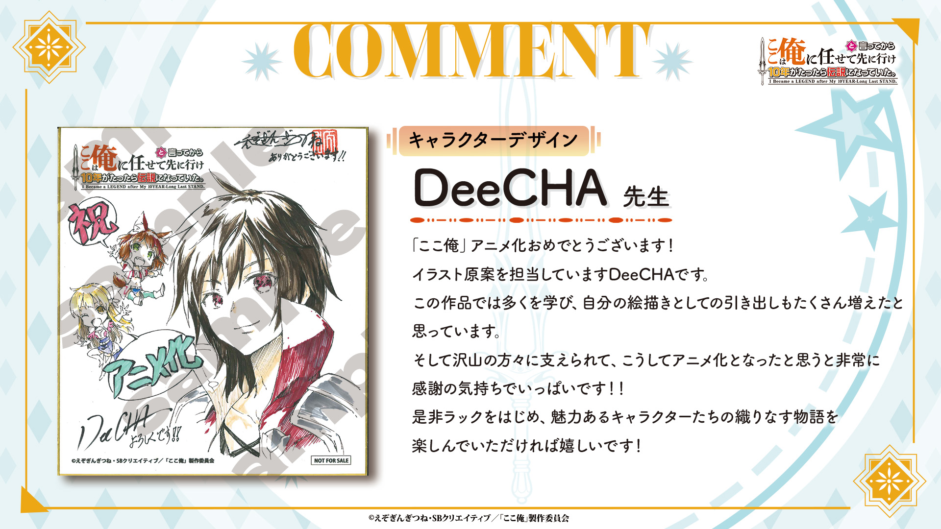 原作者のえぞぎんぎつねさんは「祝『ここは俺に任せて先に行けと言ってから10年がたったら伝説になっていた。』アニメ化! 『ここ俺』をウェブに投稿開始したのは2018年。それから小説が出版され、コミカライズもしていただき、ついにアニメ化です。ひとえに作品に関わってくれた多くの方と、応援してくださった読者の皆様のおかげです。ありがとうございます。動いて話すラックたちを見るのが楽しみです。読者の皆様もぜひ楽しみにしていただけたらうれしいです」とコメントを寄せている。