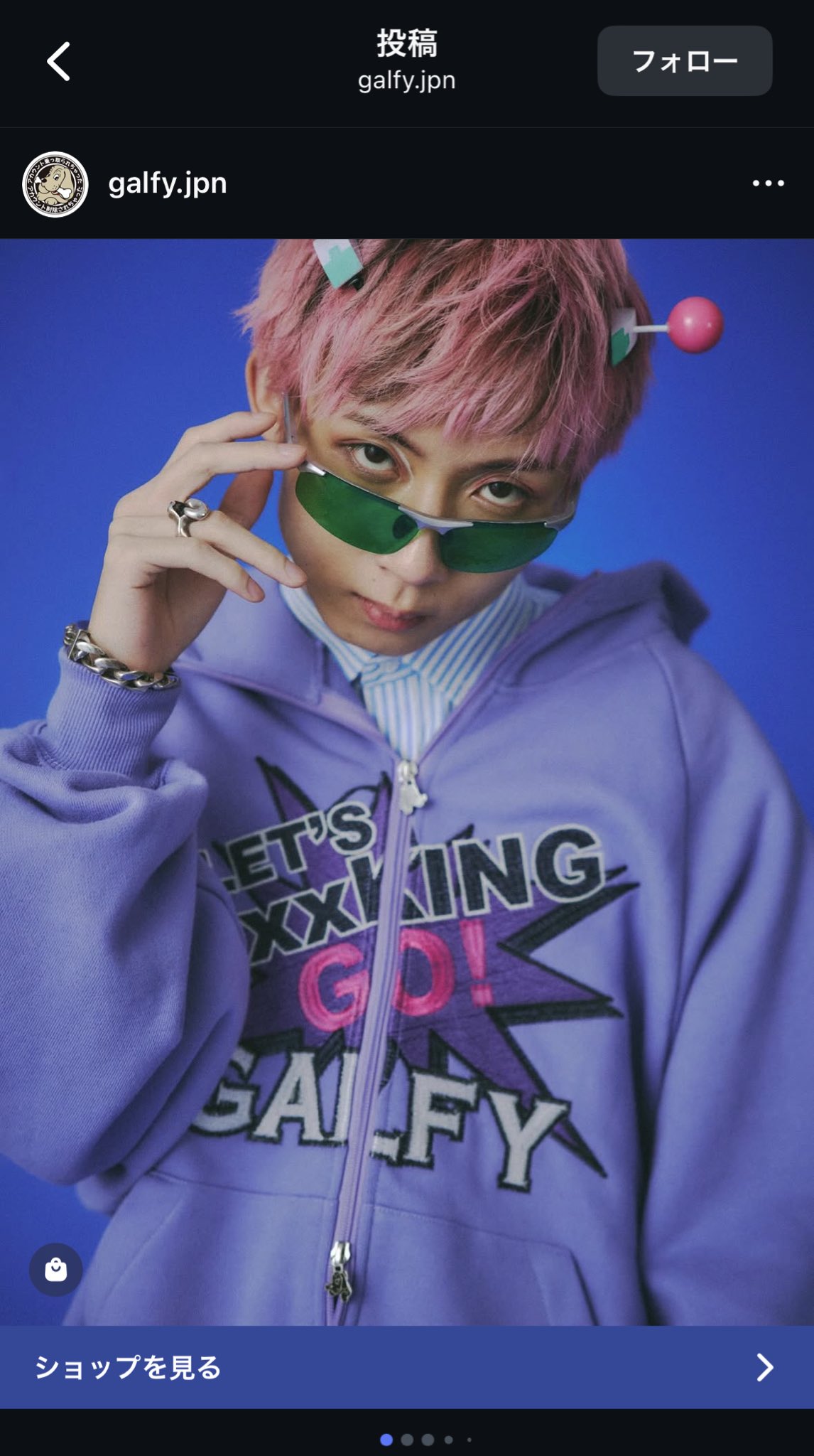 GALFY(ガルフィー)の公式Instagramに映っていたのは、ピンクの髪、緑のカラーサングラス、そして頭部から突き出す2本のアンテナ。制服こそ着ていないが、ファンなら一目で人気漫画『斉木楠雄のΨ難(さいきくすおのさいなん)』の主人公・斉木楠雄を連想する姿だ。