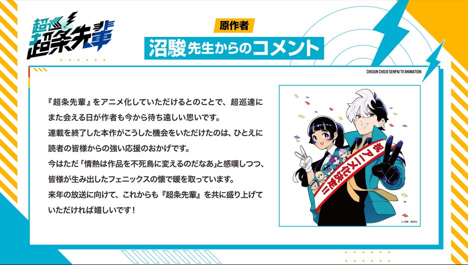 原作者の沼駿さんは「『超巡!超条先輩』をアニメ化していただけるとのことで、超巡たちにまた会える日が作者も今から待ち遠しい思いです。連載を終了した本作がこうした機会をいただけたのは、ひとえに読者の皆様からの強い応援のおかげです。今はただ『情熱は作品を不死鳥に変えるのだなあ』と感嘆しつつ、皆様が生み出したフェニックスの懐で暖を取っています。来年の放送に向けて、これからも『超条先輩』を共に盛り上げていただければうれしいです!」とコメントを寄せている。